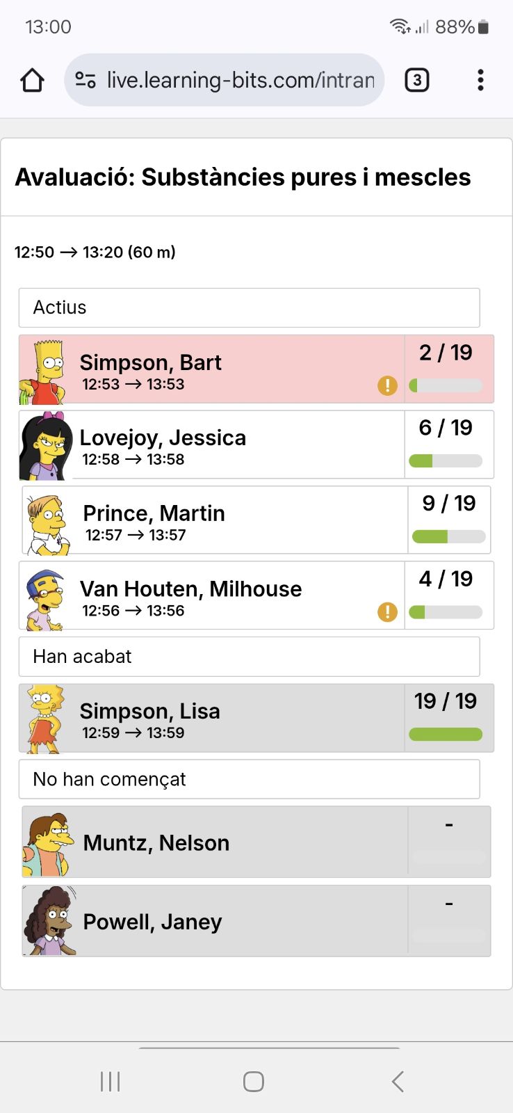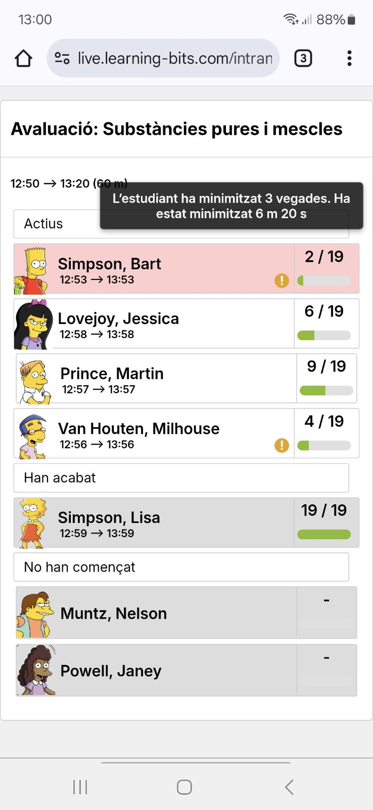Com amb el Mode LIVE, obtindràs una llista amb l’alumnat que està fent l’avaluació, juntament amb informació detallada sobre el desenvolupament de l’avaluació en temps real: