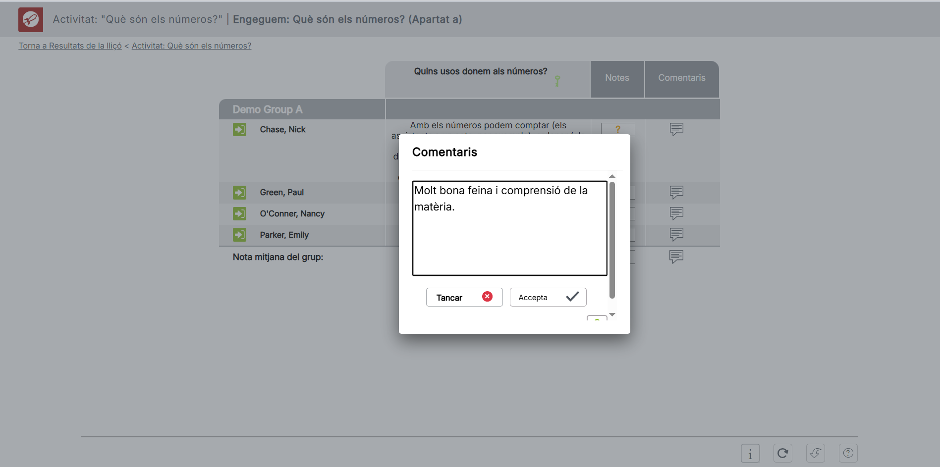 Ja és possible afegir comentaris grupals del docent des de la taula de resultats en qualsevol activitat. Igual que amb la qualificació manual a les preguntes de resposta oberta, ara pots assignar un comentari comú a tot el grup i, si ho desitges, personalitzar-lo posteriorment per a cada estudiant de manera individual.